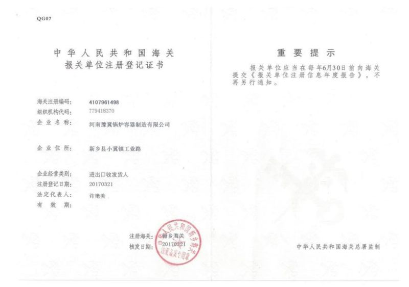 海关报关单位注册登记证书